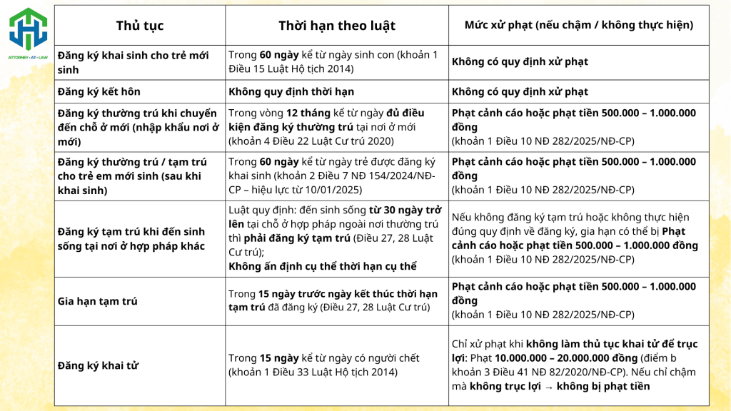 Bảng tổng kết về thời hạn, mức phạt đối với một vài thủ tục đăng ký hộ tịch, cư trú phổ biến hiện nay:
